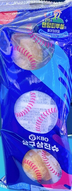 삼립과 KBO가 콜라보한 이 제품은, 푸른 배경에 야구공 이미지가 톡톡 튀고 ‘KBO 공식 제품’이라는 로고가 눈에 띄어요. 야구공 모양의 슈 안에는 랜덤으로 KBO 선수 스티커도 들어있다니… 이거 하나 사면 빵+간식+굿즈까지 1타 3피! 이런 건 무조건 모아야 제맛이죠.